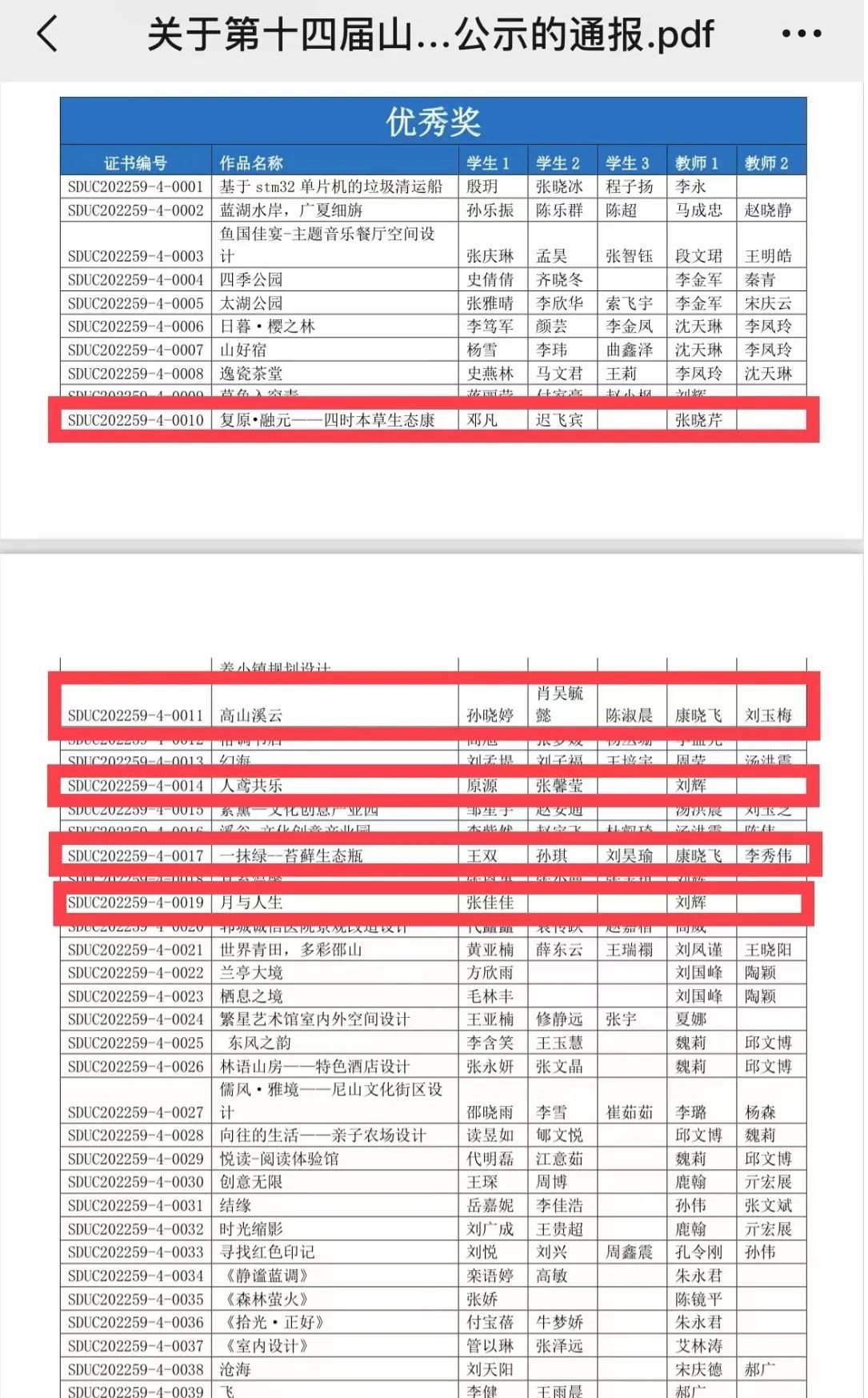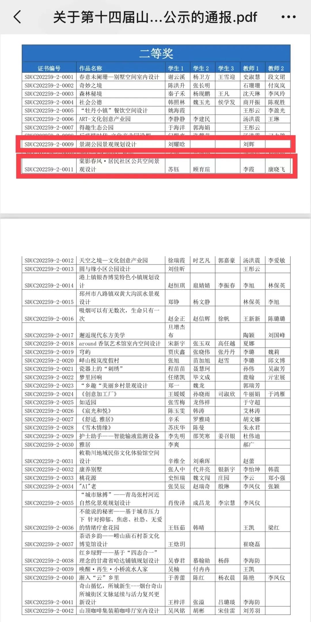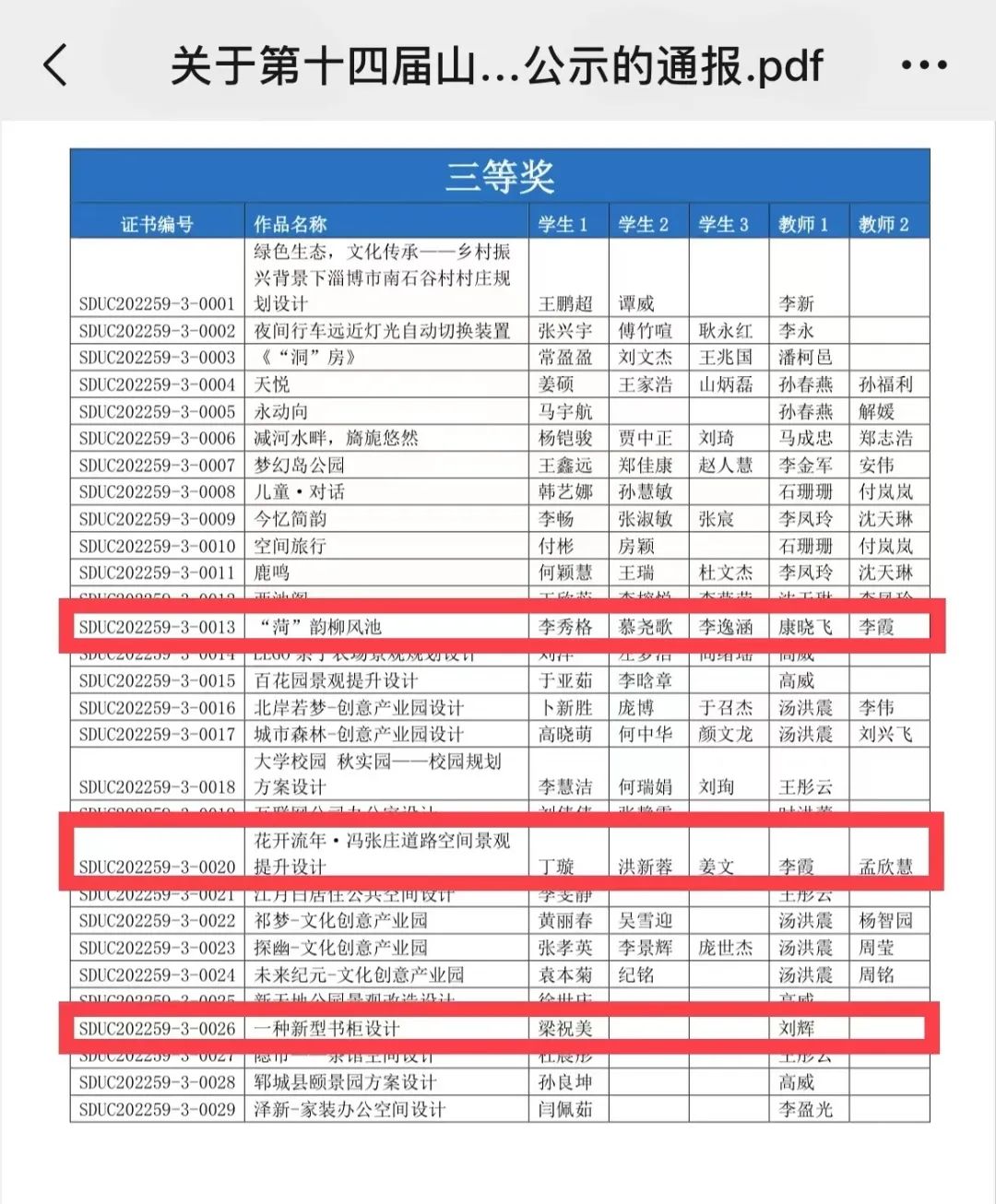 山东省第十四届老员工科技节——“赛冠杯”第三届山东省老员工环境艺术创新创意设计大赛,填补了省内无专业环艺大赛的空白,对弘扬科学精神,增强创新意识,强化技能培养,提高员工综合素质具有非常重要的作用。大赛为高校师生搭建了一个专业性、包容性的赛事平台,培养了高校员工的创新意识、团队精神和综合创造力,促进了老员工创新创业和人才培养质量提升。大赛以来,太阳集团tyc4633高度重视、师生热切关注,参赛团队积极参与,涌现出了一批优秀团队和项目作品,为取得优异成绩奠定了坚实的基础。李霞老师、康晓飞老师指导苏钰、顾育瑄等员工的《棠影春风·居民社区公共空间景观设计》和刘辉老师指导刘耀晗参赛的《景湖公园景观规划设计》获得省级二等奖。康晓飞老师、李霞老师指导李秀格、慕尧歌、李逸等员工参赛的《“菏”韵柳风池》,李霞老师、孟欣慧老师指导丁璇、洪新蓉、姜文等员工参赛的《花开流年·冯张庄道路空间景观提升设计》,刘辉老师指导的梁祝美参赛的《一种新型书柜设计》等三个项目获得省级三等奖。张晓芹老师指导邓凡、迟飞宾等员工参赛的《复原•融元——四时本草生态康》,康晓飞老师、刘玉梅老师指导孙晓婷、肖吴毓懿、陈淑晨等员工参赛的《高山溪云》,刘辉老师指导原源、张馨莹等员工参赛的《人鸢共乐》,康晓飞老师、李秀伟老师指导王双、孙琪、刘昊瑜等员工参赛的《一抹绿——苔藓生态瓶》,刘辉老师指导张佳佳参赛的《月与人生》等项目获得省级优秀奖。